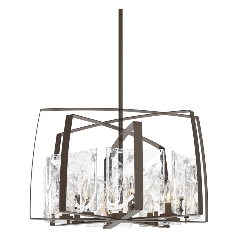 The Arc 8-Light Pendant features thick, convex panels of clear glass with abstract white swirls. An airy, handmade, steel cage-like structure emanates from a central point, surrounding the unique glass panels within. With a single multi-stem system, this p