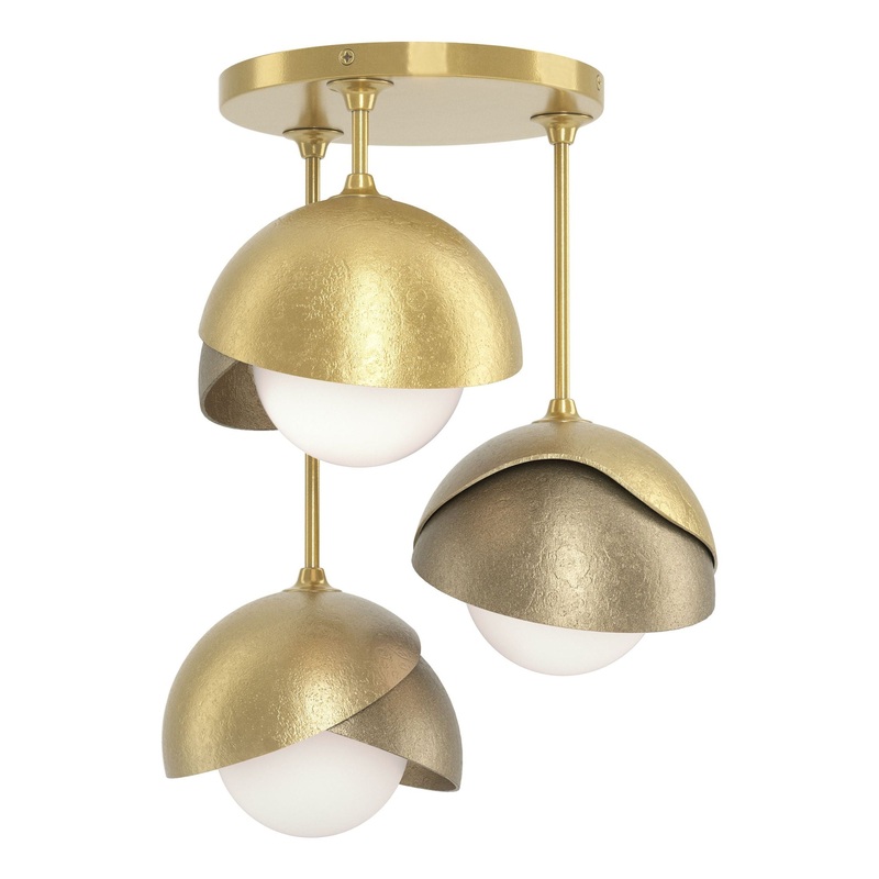 This Brooklyn Double Shade Semi-Flush has three lights extending from staggered straight arms. With the forged and textured, handcrafted two-shaded Brooklyn, the option of a two-toned ceiling fixture is offered with the ability to have one shade in an acce