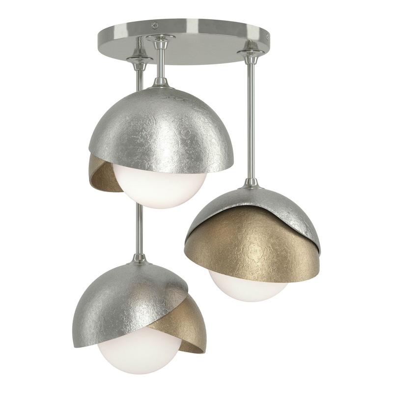 This Brooklyn Double Shade Semi-Flush has three lights extending from staggered straight arms. With the forged and textured, handcrafted two-shaded Brooklyn, the option of a two-toned ceiling fixture is offered with the ability to have one shade in an acce
