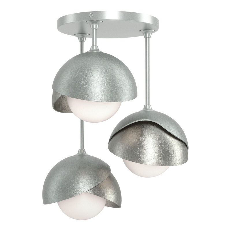 This Brooklyn Double Shade Semi-Flush has three lights extending from staggered straight arms. With the forged and textured, handcrafted two-shaded Brooklyn, the option of a two-toned ceiling fixture is offered with the ability to have one shade in an accent color. Available in all standard finishes.
