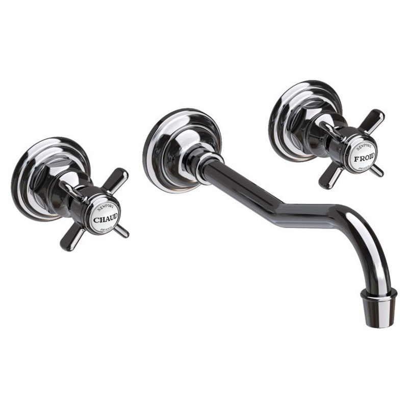 This two-handle wall-mounted bathroom faucet features classic cross-style handles, a 10-1/8″ long rigid spout with a 9-3/4″ reach, and durable construction. Intended for use with Newport Brass rough-in valve which is sold separately. The rough valve incorporates a brass valve body assembly and quarter-turn washerless ceramic disc valve cartridges.