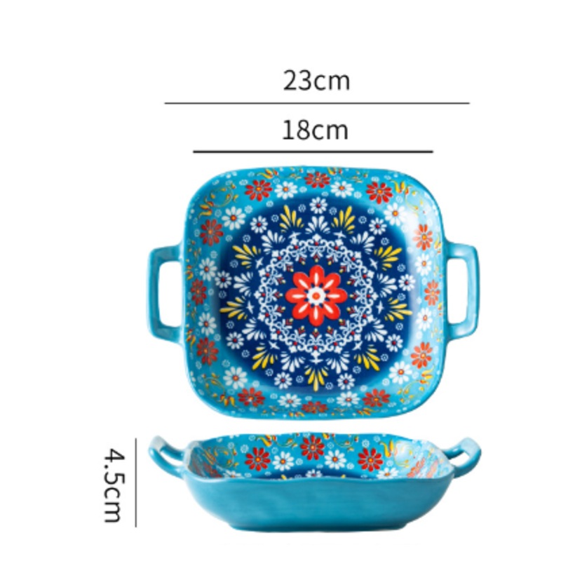 The 9-Inch Bohemian Ceramic Double-Handled Square Plate combines elegance with functionality for your dining needs. Its distinctive Bohemian design, paired with dual handles, makes it a standout piece for serving fruits, salads, or other culinary creations. Measuring 9 inches, this square plate offers a perfect balance of style and practicality, ideal for home use or entertaining guests. Crafted from durable ceramic, it resists chipping and cracking, ensuring long-term use. Easy to clean and dishwasher-safe, this new-style plate brings a high-design appeal to your kitchen or dining table, making every meal a visual delight.