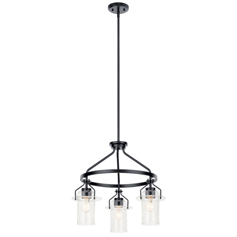 The Everett 22.5 inch 3 light chandelier adds a dash of industrial glam to your space. Three mini Clear Glass pendants are suspended from an open metal circle finished in Black. A delicate clear acrylic disc appears to hold each pendant and your attention.