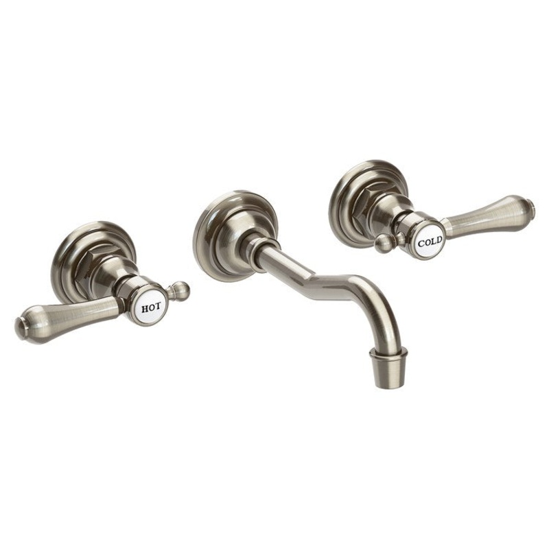 Lavatory Faucet Chesterfield Wall Mount Hot Cold Indicators 8 Inch Spread 2 Lever ADA WaterSense Antique Nickel 1.2 Gallons Per Minute Brass Less Drain Spout Reach 7-1/4 Inch