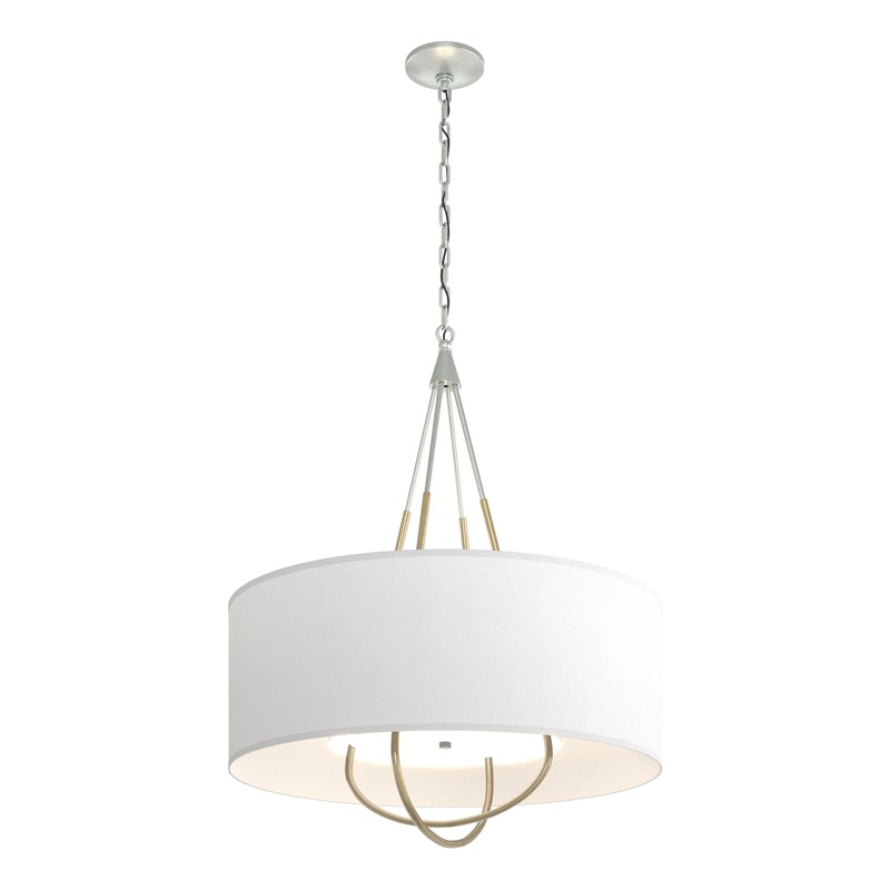 Refinement of materials and purity of line combine to make the Loop Pendant an elegant and versatile choice. Explore the many options this fixture offersselect a base finish for the canopy and chain, an accent finish for the intercrossed loops, and multiple outer shade color choices. A white inner shade gracefully diffuses the light while providing a tailored detail.