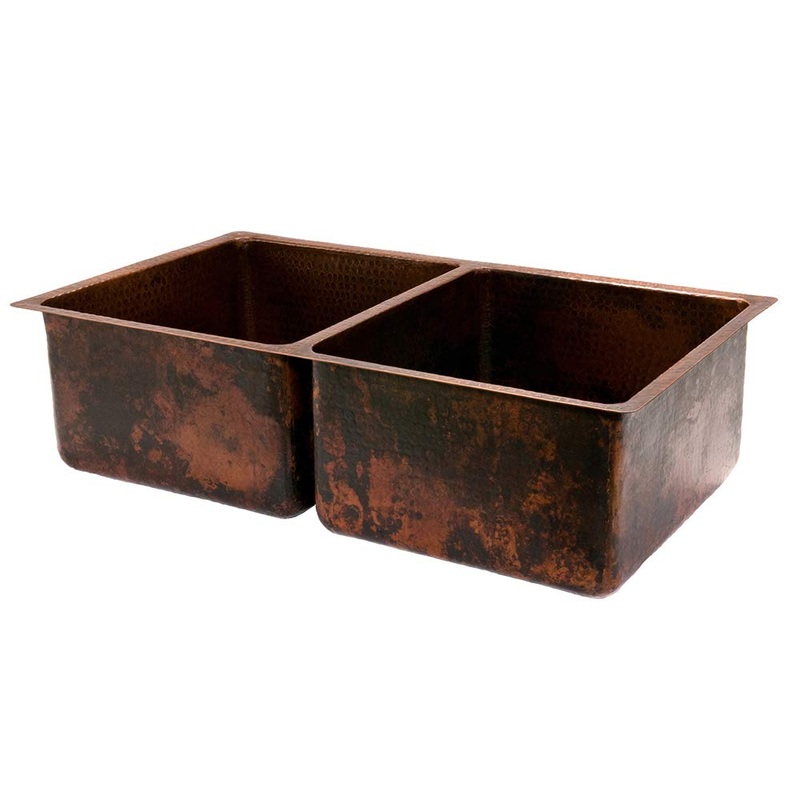 Uncompromising quality, beauty and functionality make up this Premier 33-Inch Copper Hammered Kitchen 50/50 Double Basin Sink. Each Premier Copper Sink is optimized to allow ample room to deck mount your faucet in a standard 25-Inch countertop. Green recyc