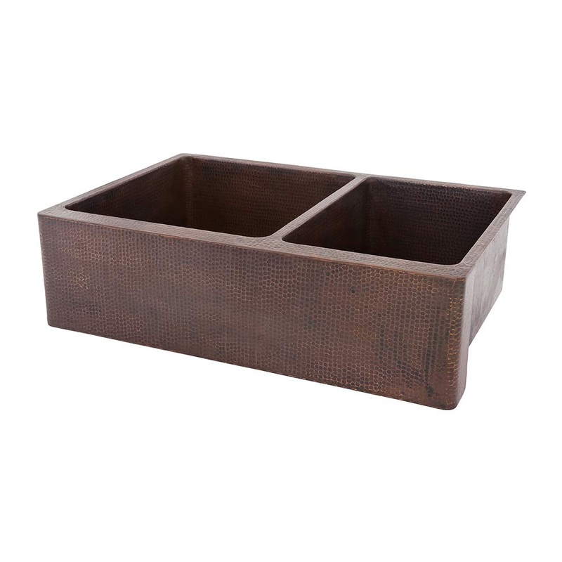 33-Inch Hammered Copper Kitchen Apron 60/40 Double Basin Sink Each Premier Copper Sink is optimized to allow ample room to deck mount your faucet in a standard 25-Inch countertop. Green recyclable products like copper sinks are a must have in today’s modern home. This product is sure to impress your guests and satisfaction is always guaranteed. Apron Front 60/40 Basin Split. Hammered Copper Surface. Dimensions: left large basin 17.5-Inch by 19-Inch by 9-Inch, right small basin 12.5-Inch by 19-Inch by 9-Inch, apron depth 9-Inch, outer 33-Inch by 22-Inch by 9-Inch. Installation Type: under counter or surface-mount. Divider: 1-Inch wide (optimized). Countertop Depth Required: 25-Inch front to back. Material gauge: Industry Best (14-guage or .0625-Inch). Drain size is 3.5-Inch. Suggested Drain Models: D-130ORB, D-132ORB (Drain sold separately). The faucet mounting position is counter deck mount. It is handmade, 100-Percent recyclable and made of 99.7-Percent pure recycled copper. It is Lead Free (less than 0.01-Percent). Suggested accessories: Installation Silicone for Model: C900-ORB, Copper Sink Wax- Model: W900-WAX, Pull Down Kitchen Faucet – Model: K-PD01ORB.From the Manufacturer33-Inch Hammered Copper Kitchen Apron 60/40 Double Basin Sink Each Premier Copper Sink is optimized to allow ample room to deck mount your faucet in a standard 25-Inch countertop. Green recyclable products like copper sinks are a must have in today’s modern home. This product is sure to impress your guests and satisfaction is always guaranteed. Apron Front 60/40 Basin Split. Hammered Copper Surface. Dimensions: left large basin 17.5-Inch by 19-Inch by 9-Inch, right small basin 12.5-Inch by 19-Inch by 9-Inch, apron depth 9-Inch, outer 33-Inch by 22-Inch by 9-Inch. Installation Type: under counter or surface-mount. Divider: 1-Inch wide (optimized). Countertop Depth Required: 25-Inch front to back. Material gauge: Industry Best (14-guage or .0625-Inch). Drain size is 3.5-Inch. Suggested Drain Models: D-130ORB, D-132ORB (Drain sold separately). The faucet mounting position is counter deck mount. It is handmade, 100-Percent recyclable and made of 99.7-Percent pure recycled copper. It is Lead Free (less than 0.01-Percent). Suggested accessories: Installation Silicone for Model: C900-ORB, Copper Sink Wax- Model: W900-WAX, Pull Down Kitchen Faucet – Model: K-PD01ORB.