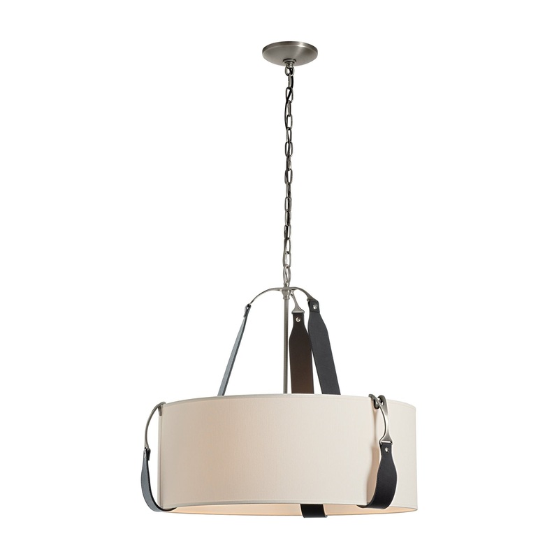 A classic shape with sophisticated, equestrian details. A round, drum shade is held by maker's hooks with three artisanally-made leather straps, available in 3 colors and your choice of Polished Nickel or Antique Brass hardware. Also available in a larger