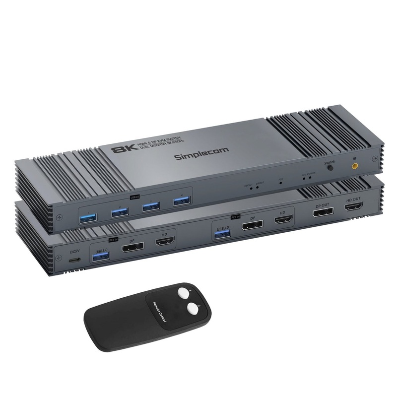 Simplecom KM490 HDMI and DisplayPort Dual Monitor KVM Switch for 2 Computers with 4-Port USB 3.0 Hub 5Gbps 8K@60Hz This Dual Monitor KVM Switch is an efficient solution designed to simplify your workspace by allowing two computers to share two displays and