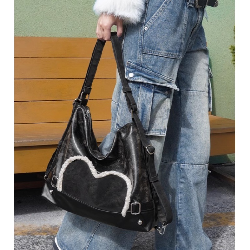 Elevate your style with our Premium Black Tote Backpack, designed for versatility and sophistication. Crafted from a blend of high-quality PU leather (50% matte PU, 40% glossy PU), this bag features a distinctive white heart-shaped fur accent for a touch of elegance. Measuring 36 x 32.5 x 12 cm and weighing just 555g, it’s lightweight yet spacious, perfect for work, travel, or casual outings across Sydney, Melbourne, or Brisbane.