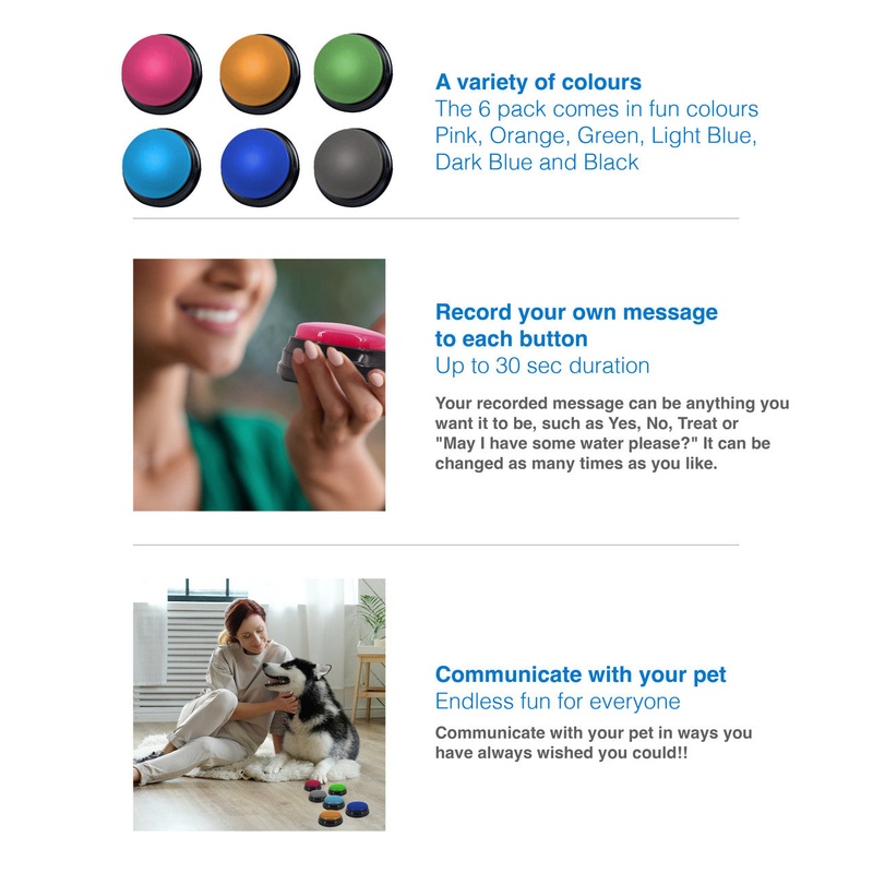 Ever wondered what your dog or cat might want to say to you? With the Tech4Pets Talking Buttons 6-Pack, you can finally find out! These interactive, colorful pet buttons provide endless fun and communication possibilities for you and your pets.Record your